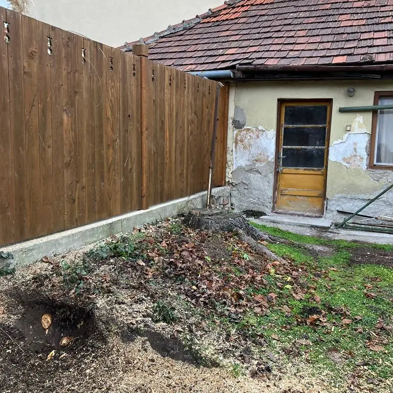 Miskolc – Újdiósgyőrben egy családi ház kertjében négy hatalmas kivágott fenyőfa tuskójának és mélyen gyökerező maradványainak eltávolítását végeztem el. A tulajdonos célja az volt, hogy a kertet azonos szintbe hozza, ezzel előkészítve a területet további munkálatokhoz, például füvesítéshez vagy térburkoláshoz.